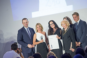 v.l.n.r. Bundesgesundheitsminister Jens Spahn, Moderatorin Yve Fehring, Eugenia Krone (mamazone e.V.), Almuth Fischer (mamazone e.V), Nicole Tappeé und Dr. Guido Mecklenbeck (Vendus Sales & Communication Group aus Düsseldorf)