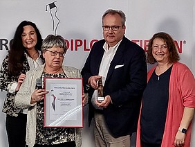 Preisverleihung Busenfreund-Award 2022 von den mamazone Vorständinnen Brigitte Welter, Romana Gilg und Eugenia Krone (von rechts nach links) an Prof. Dr. med. Jakisch. Ort: Universitätsklinik Augsburg am 15.10.2022. Fotografin: Iris Sparenberg