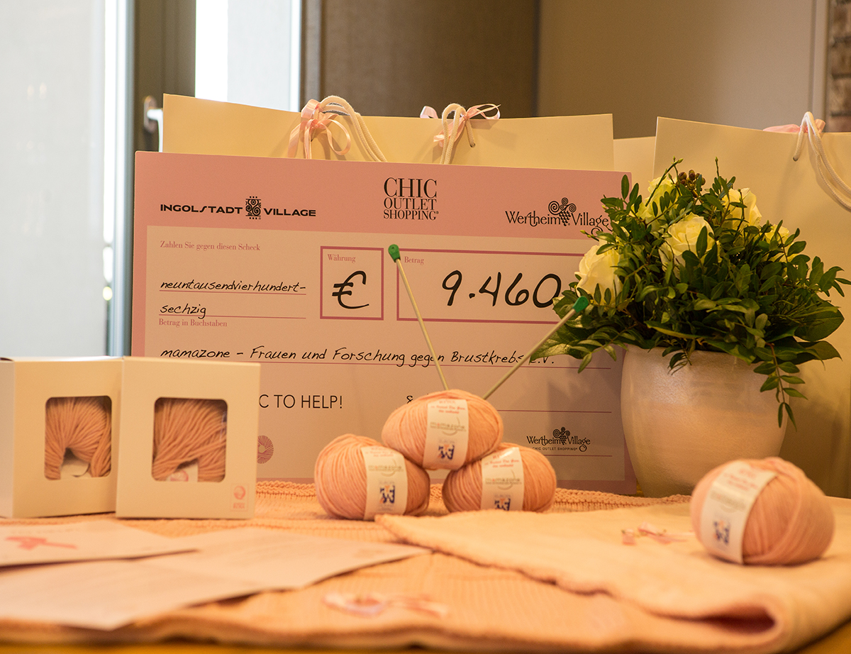 Zum internationalen World Womens Day, am Samstag, den 8. März 2014, lud Chic Outlet Shopping® nach Ingolstadt Village bei München ein. Das bewusst ausgewählte Datum bildete den Rahmen für den Abschluss der ersten Etappe einer einzigartigen Charity-Aktion, welche die beiden Villages – Ingolstadt Village und Wertheim Village – im internationalen Brustkrebsmonat Oktober im letzten Jahr ins Leben gerufen hatten. Zunächst wurde der Spenden-Scheck seitens der beiden Villages, an den Vorstand von mamazone e.V. übergeben. Die handgefertigten Wolldecken, die als Solidaritätsprojekt von Frauen für Frauen entstanden sind, wurden im Anschluss von mamazone e.V. und den Villages an die Vertreter der Krankenhäuser übergeben und werden in den nächsten Monaten an Frauen in Chemotherapie geschenkt.