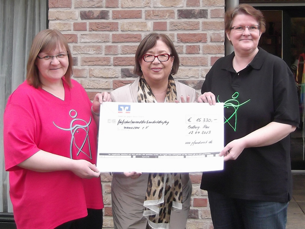 Augsburg, 15.04.13: Im Internetportal <link http: www.pfundsweib.de _blank external-link-new-window zur>www.pfundsweib.de tauschen sich seit knapp 13 Jahren übergewichtige Frauen über den Kampf mit den Kilos aus. Sie unterstützen sich, geben sich Tipps und halten zueinander. Die aktive Gemeinschaft von 1400 Frauen sammelt jährlich in der Weihnachtszeit Geld für einen guten Zweck und beschließt vorher in einer anonymen Abstimmung, wer der Spendenempfänger werden soll. Dieses Mal fiel die Wahl auf die bundesweit aktive Patientinnen-Initiative mamazone – Frauen und Forschung gegen Brustkrebs e.V. Der Verein mit Sitz in Augsburg freut sich über die äußerst großzügige Summe von 15.330 Euro, die nun der Unterstützung von betroffenen Frauen und Projekten zur Aufklärung und Sensibilisierung der Öffentlichkeit zugute kommen.