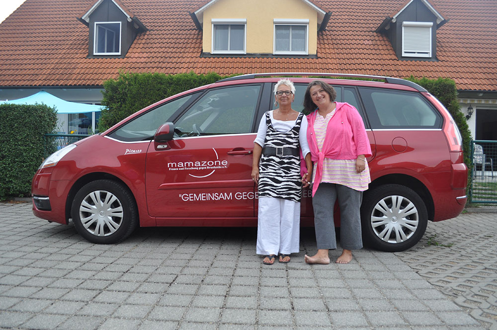 Bild 1: Im Falle eines Gewinns würde der Verein mamazone das Preisgeld für das Projekt „mamazone-Mobil“ verwenden. Vor dem Info-Auto (v.l.n.r.): Lissy Hantke und Biggi Welter.