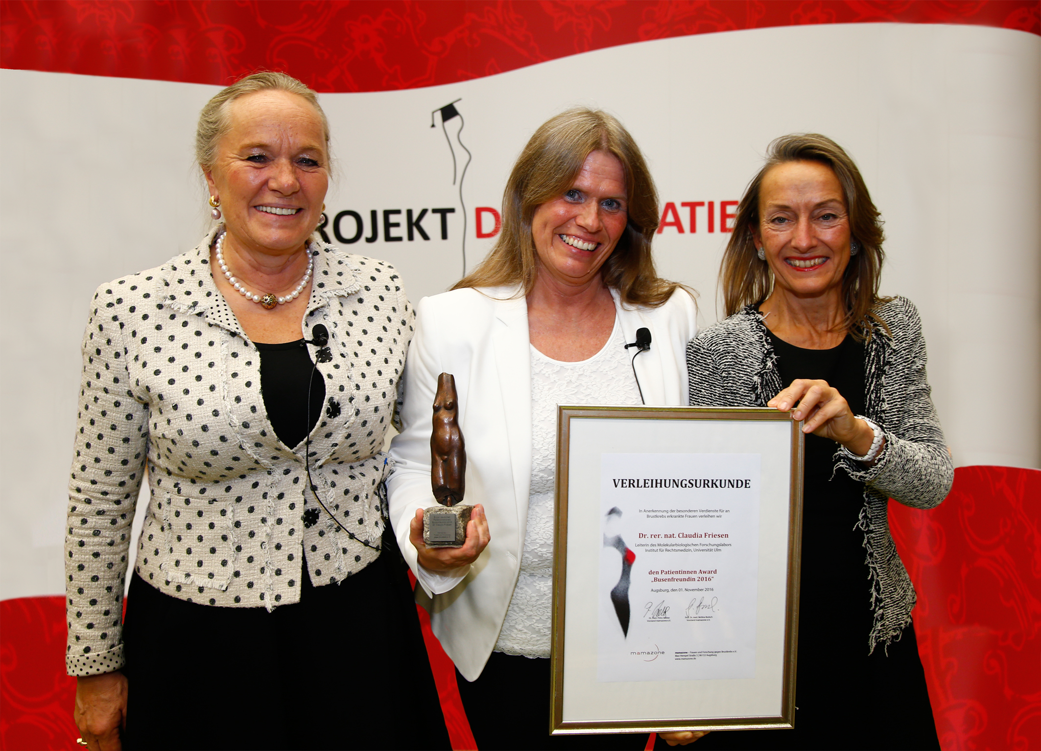 „mamazone gratuliert Dr. Claudia Friesen zu ihren Forschungsergebnissen, zu ihrem Engagement und ihrer Ausdauer und verleiht ihr in Anerkennung ihrer Arbeit den Busenfreundin-Award 2016! Unser Preis soll unseren Dank symbolisieren und gleichzeitig für die Zukunft Rückenwind geben und den Wunsch der ‚mamazonen’ signalisieren, mit hoher Geschwindigkeit weiter zu forschen“, sagte Dr. Petra Stieber, Vorstandsmitglied von mamazone – Frauen und Forschung gegen Brustkrebs e.V., in ihrer Laudatio.