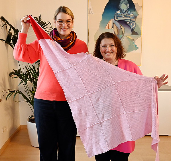 Biggi Welter, Vorstandsmitglied, stellt mit Oberbürgermeistern Eva Weber das „Umarmungstuch“ vor: